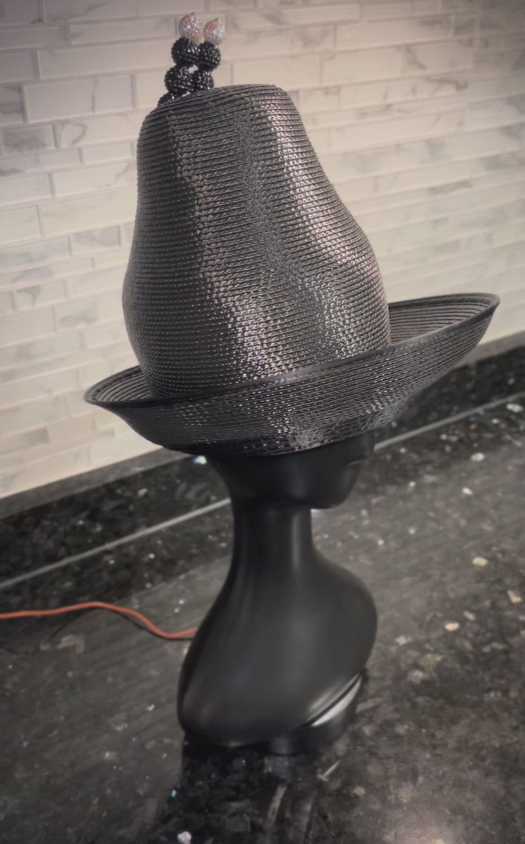 Haus of Clothier Custom Crown 👑: Black Swiss Braid Brimmed Crown adorned with a row of black Satin Ribbon and two accented hat-pins