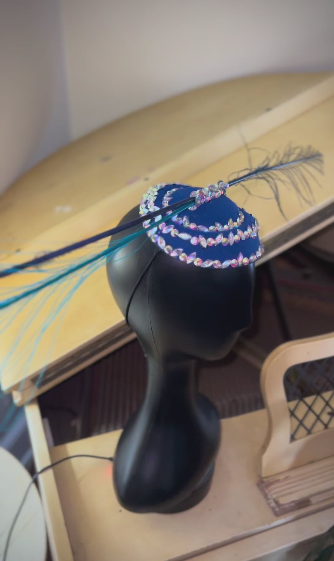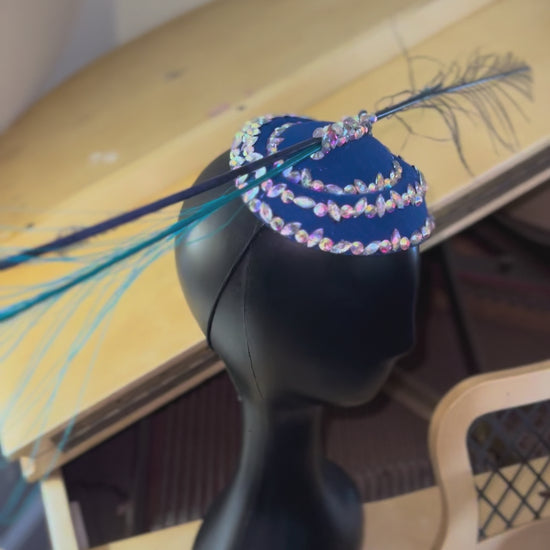 Haus of Clothier Custom Crown 👑: Blue Bumper Crystal Peacock Headpiece adorned with AB crystals and two genuine Peacock feather stems