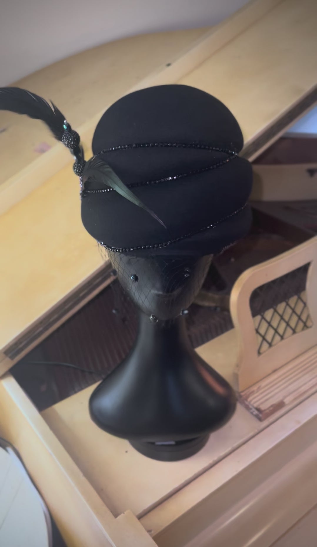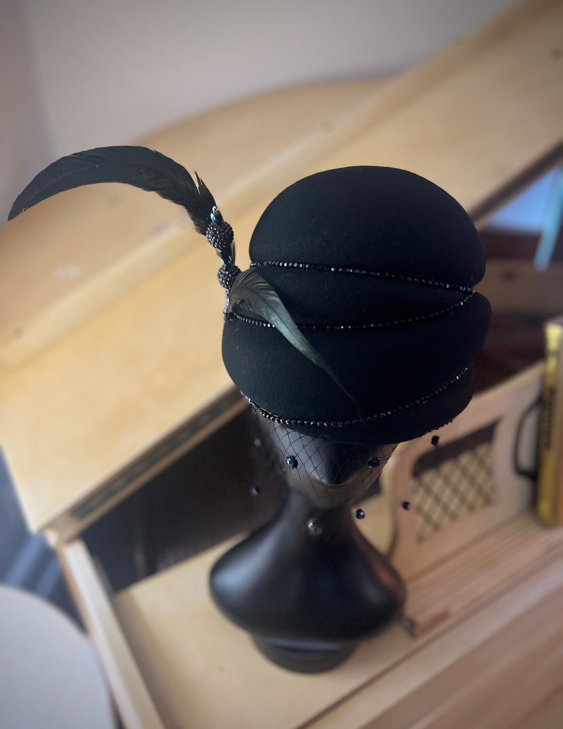 Haus of Clothier Custom Crown 👑: 50's designed Black Genuine Felt Turban adorned with AB (Aurora Borealis) stones, hat-pin, genuine feathers & veilÂ