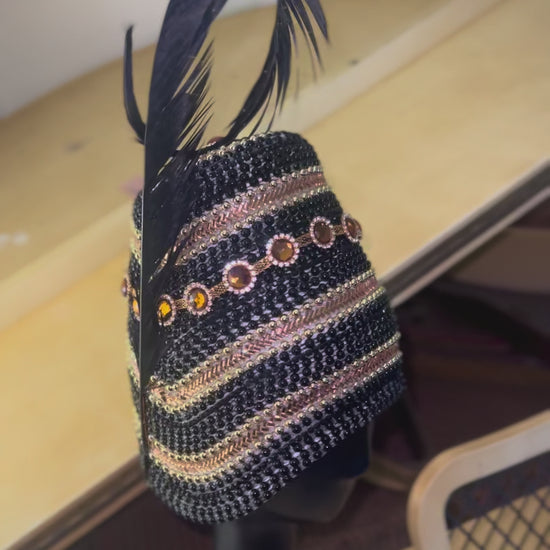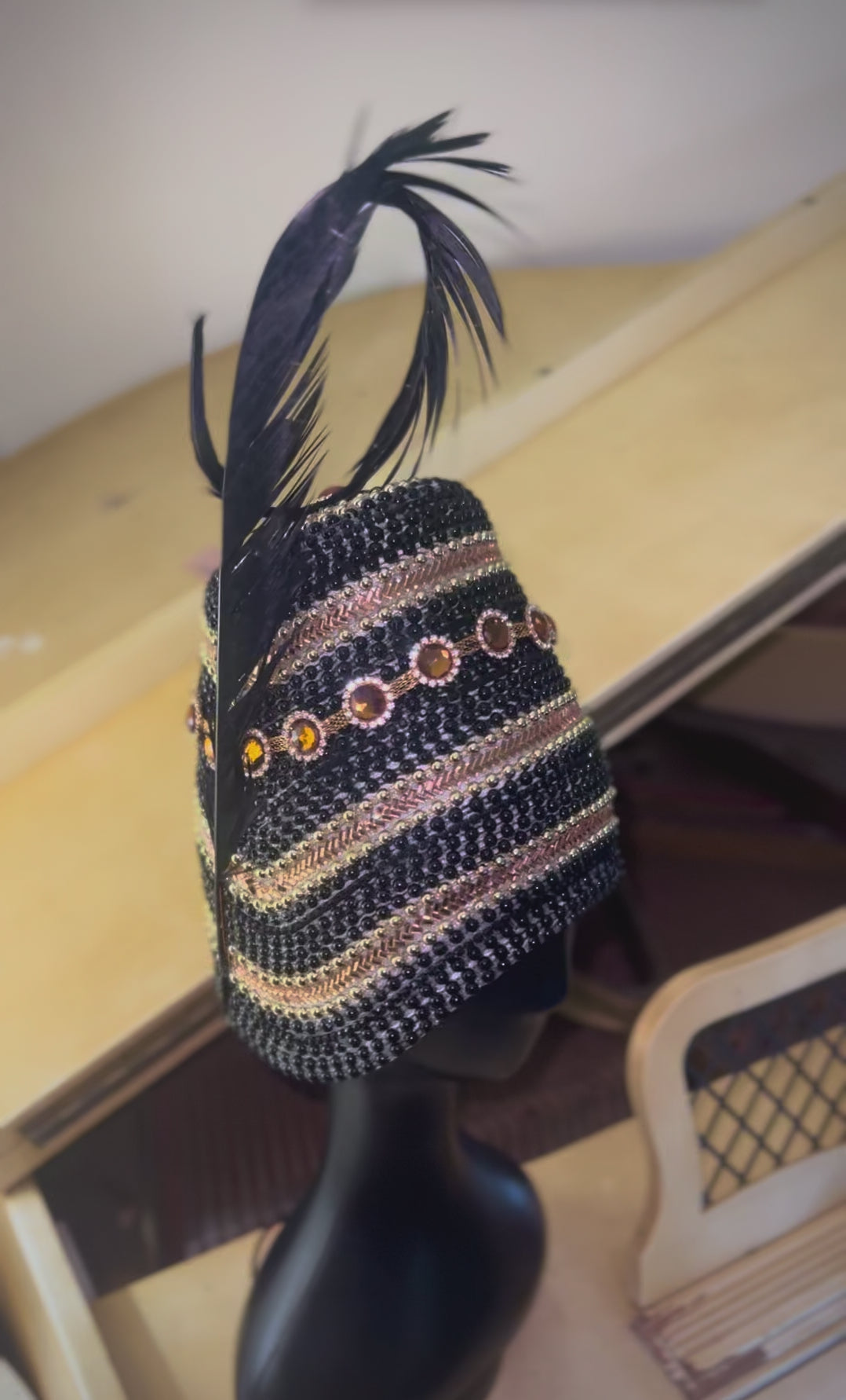 Haus of Clothier Custom Crown 👑: Egyptian Black and Gold Shimmer Crown adorned with Topaz Gold stones and a genuine black Goldentail feather
