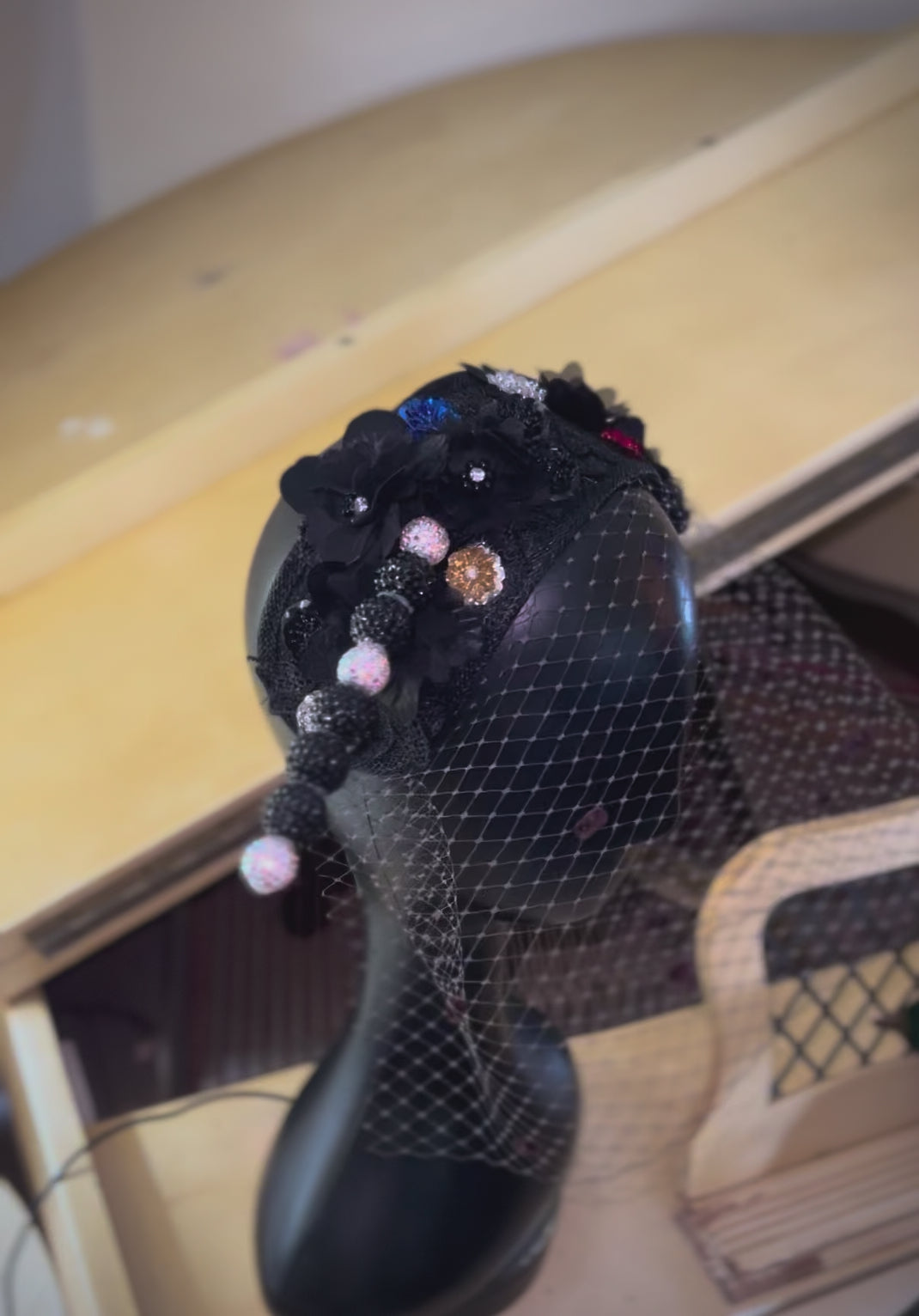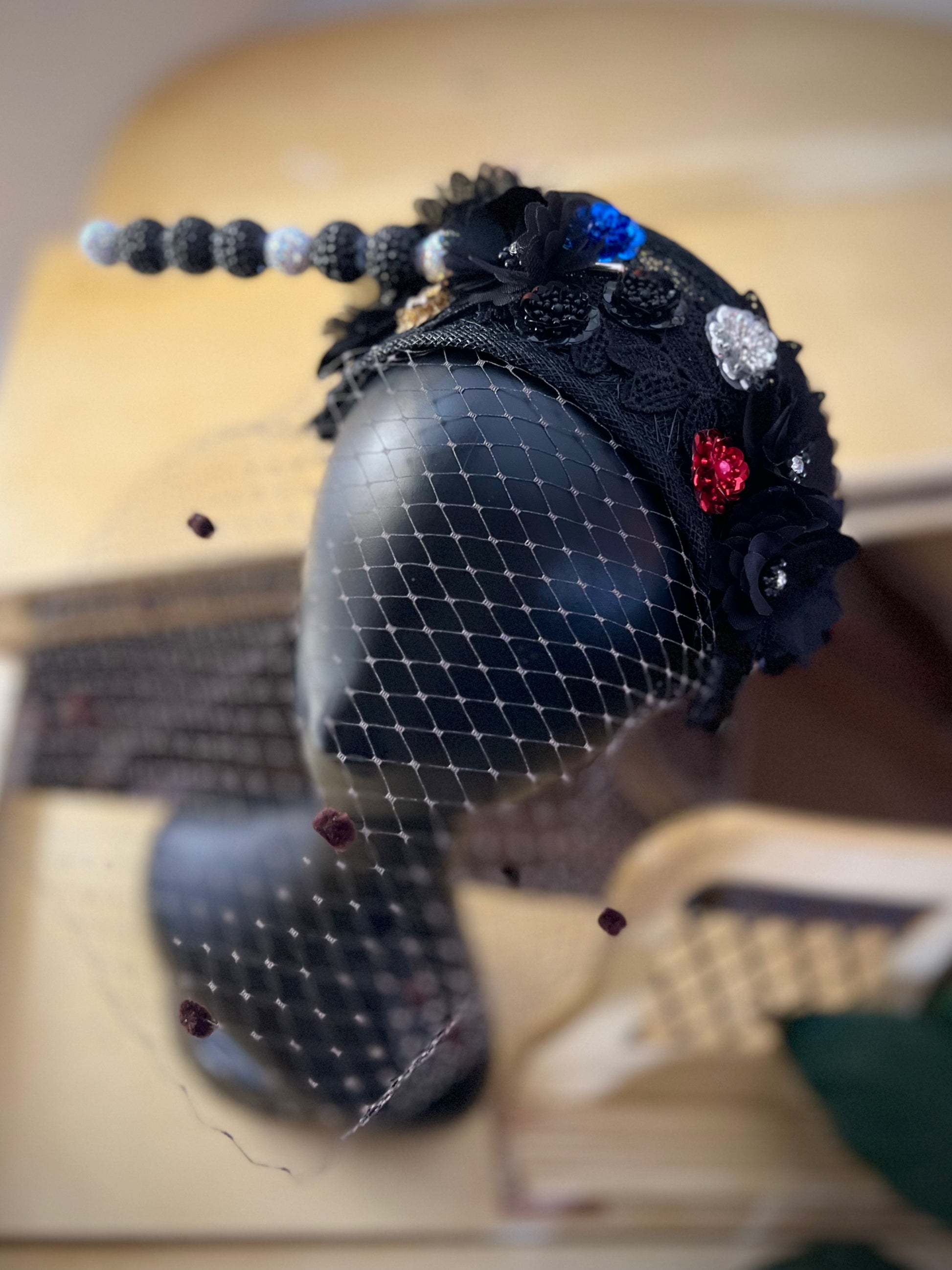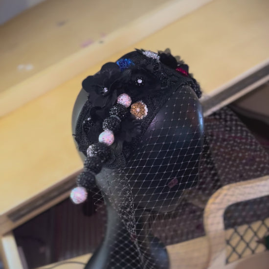 Haus of Clothier Custom Crown 👑: Ornate Floral Headband adorned with Black floral hand-stitched lace, multi-color flowers, midnight chenille dot veiling, and an accented AB hat-pin