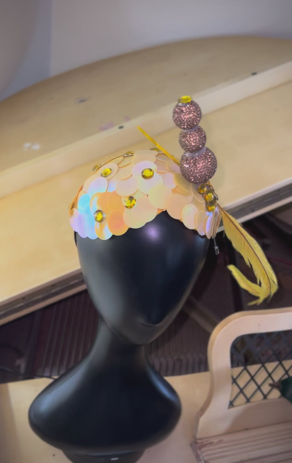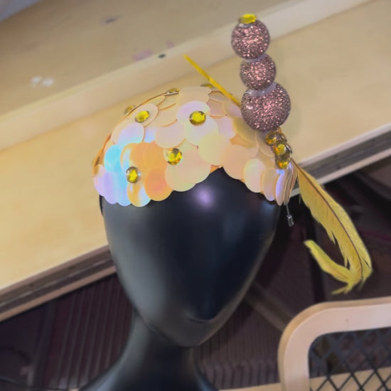 Haus of Clothier Custom Crown 👑: Yellow Double Teardrop Fascinator adorned with AB yellow sequin pailettes, yellow gem stones, a stoned hat-pin & a genuine Pheasant Ringneck feather